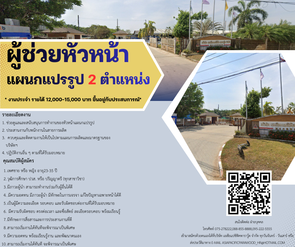 ตำแหน่ง ผู้ช่วยหัวหน้าแผนกแปรรูป ด่วน!