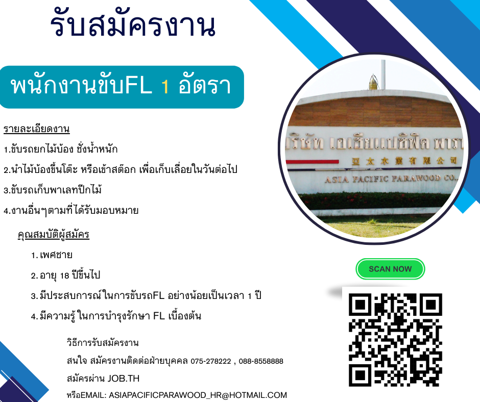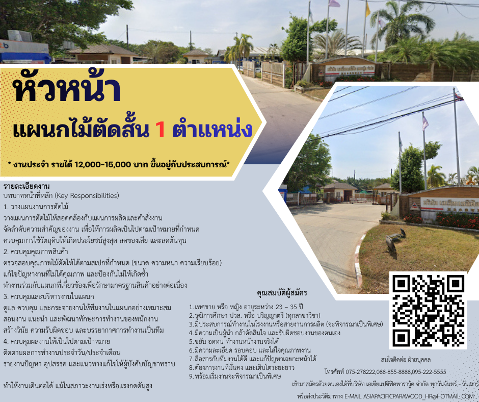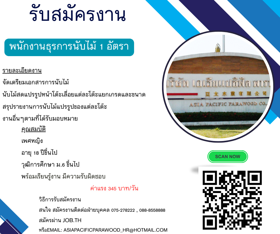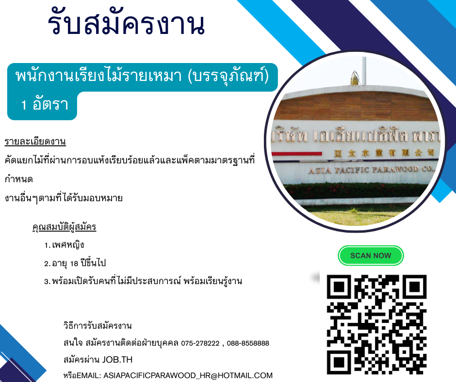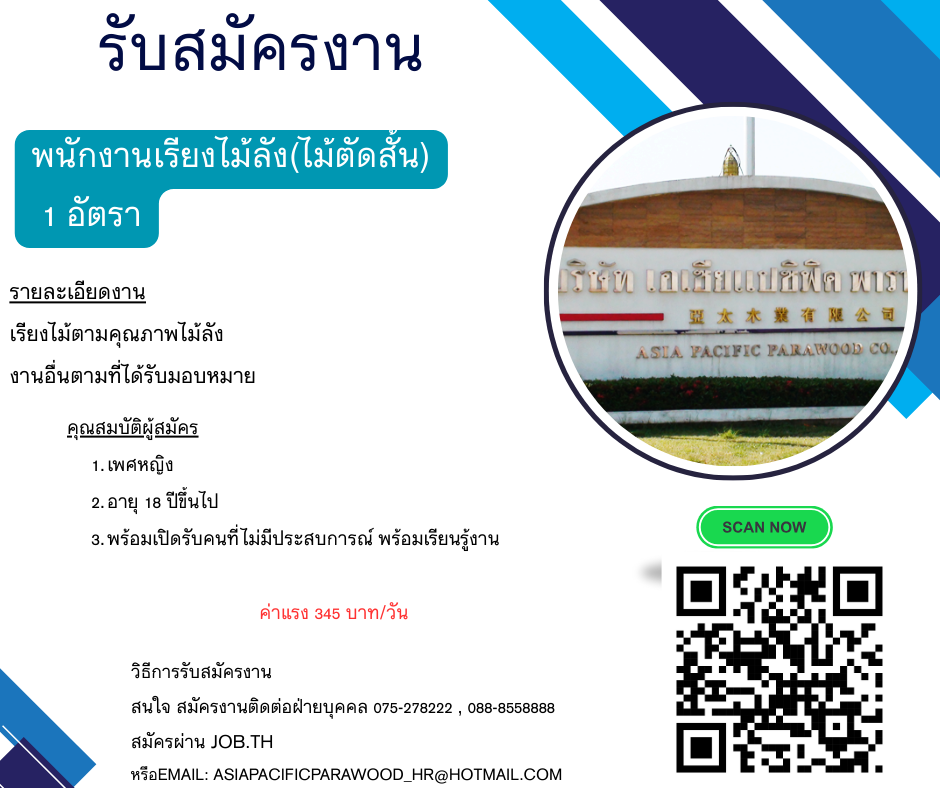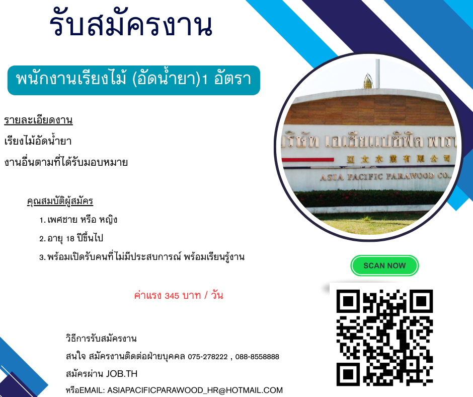 สมัครด้วยตนเองหรือส่ง Resume (ประวัติ) ได้ที่ asiapacificparawood_hr@hotmail.com